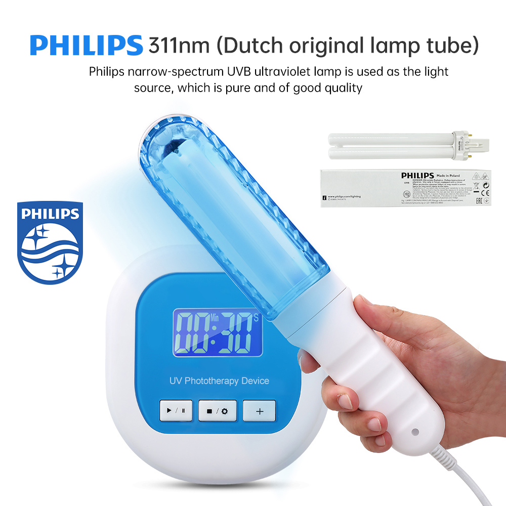 Bu UVB lambalarımız, birçok klinik denemeyle kanıtlanmış dar bantlı bir UVB 311 nm Philips lambayla donatılmıştır.Elde taşınır olduğundan daha kontrollü bir maruziyet elde edebilir, tedavi masraflarını ve süresini azaltabilirsiniz.Ayrıca tedaviniz biter bitmez UVB lambanızı bir sonraki kullanımınıza kadar rahatlıkla saklayabilirsiniz.